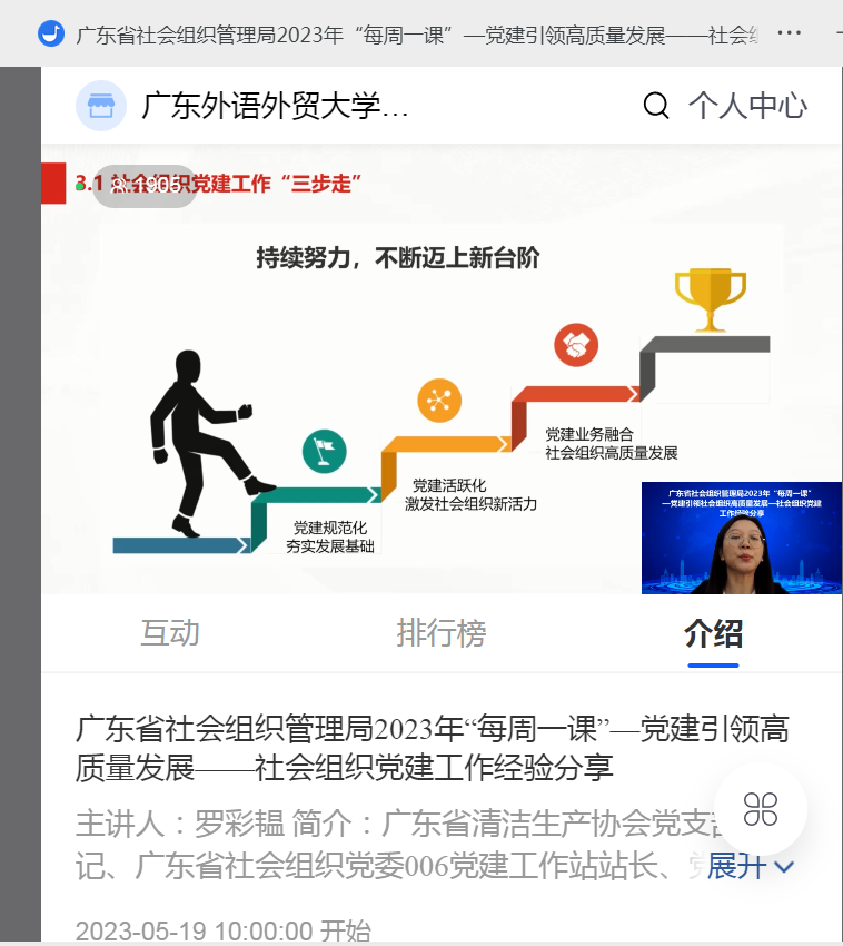 5月19日觀(guān)看學(xué)習(xí)“黨建引領(lǐng)高質(zhì)量發(fā)展--社會(huì)組織黨建工作經(jīng)驗(yàn)分享”,廣東省社會(huì)組織管理局邀請(qǐng)了廣東省清潔生產(chǎn)協(xié)會(huì)黨支部書(shū)記、廣東省社會(huì)組織黨委006黨建工作站長(zhǎng)、黨建工作指導(dǎo)員羅彩韞為主講人。主要介紹社會(huì)組織黨支部建設(shè)經(jīng)驗(yàn)和黨建創(chuàng)新工作方法,通過(guò)高質(zhì)量黨建促進(jìn)社會(huì)組織高質(zhì)量發(fā)展。