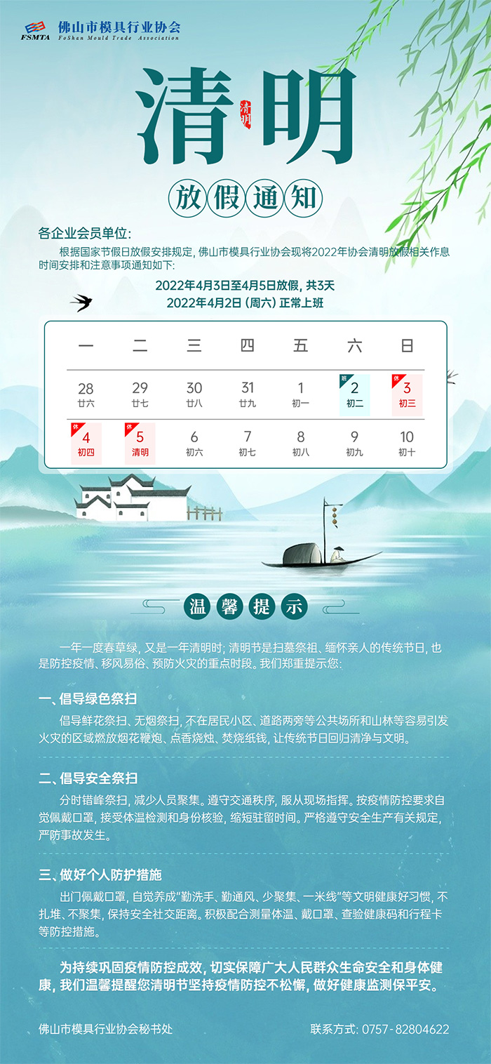 根據(jù)國家節(jié)假日放假安排規(guī)定,佛山市模具行業(yè)協(xié)會現(xiàn)將2022年協(xié)會清明節(jié)放假相關(guān)作息時間安排和注意事項通知如下: