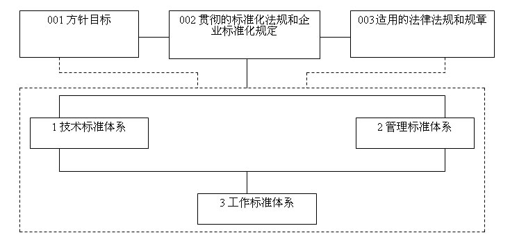 注2:虛線框上方是對企業(yè)標準體系起指導性作用的文件,包括本企業(yè)方針目標、企業(yè)貫徹的標準化法規(guī)和企業(yè)標準化規(guī)定、企業(yè)適用的法律法規(guī)和規(guī)章。